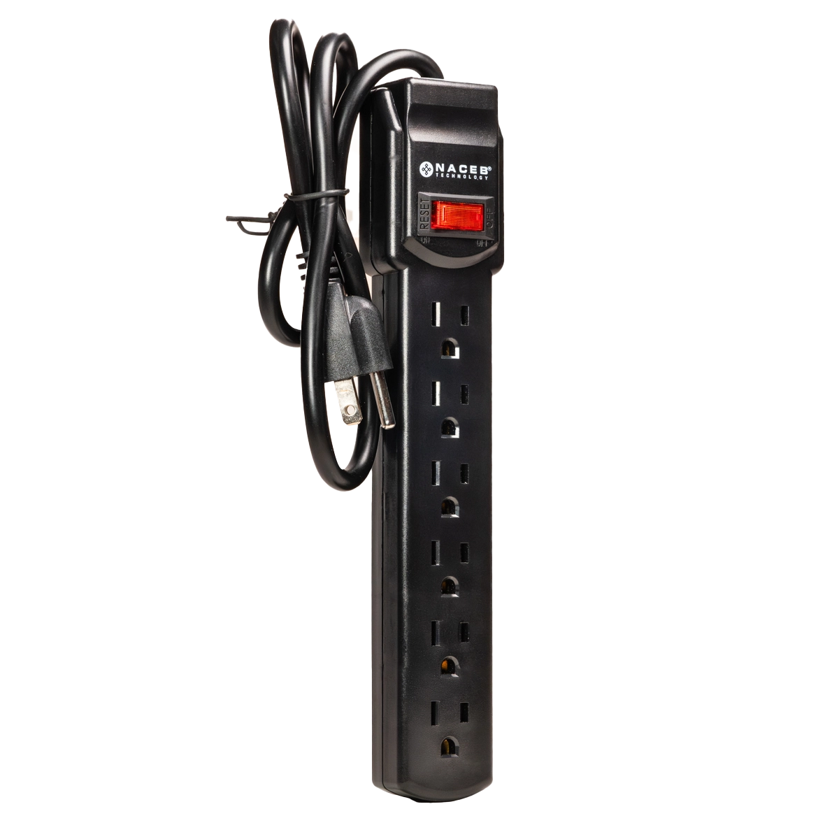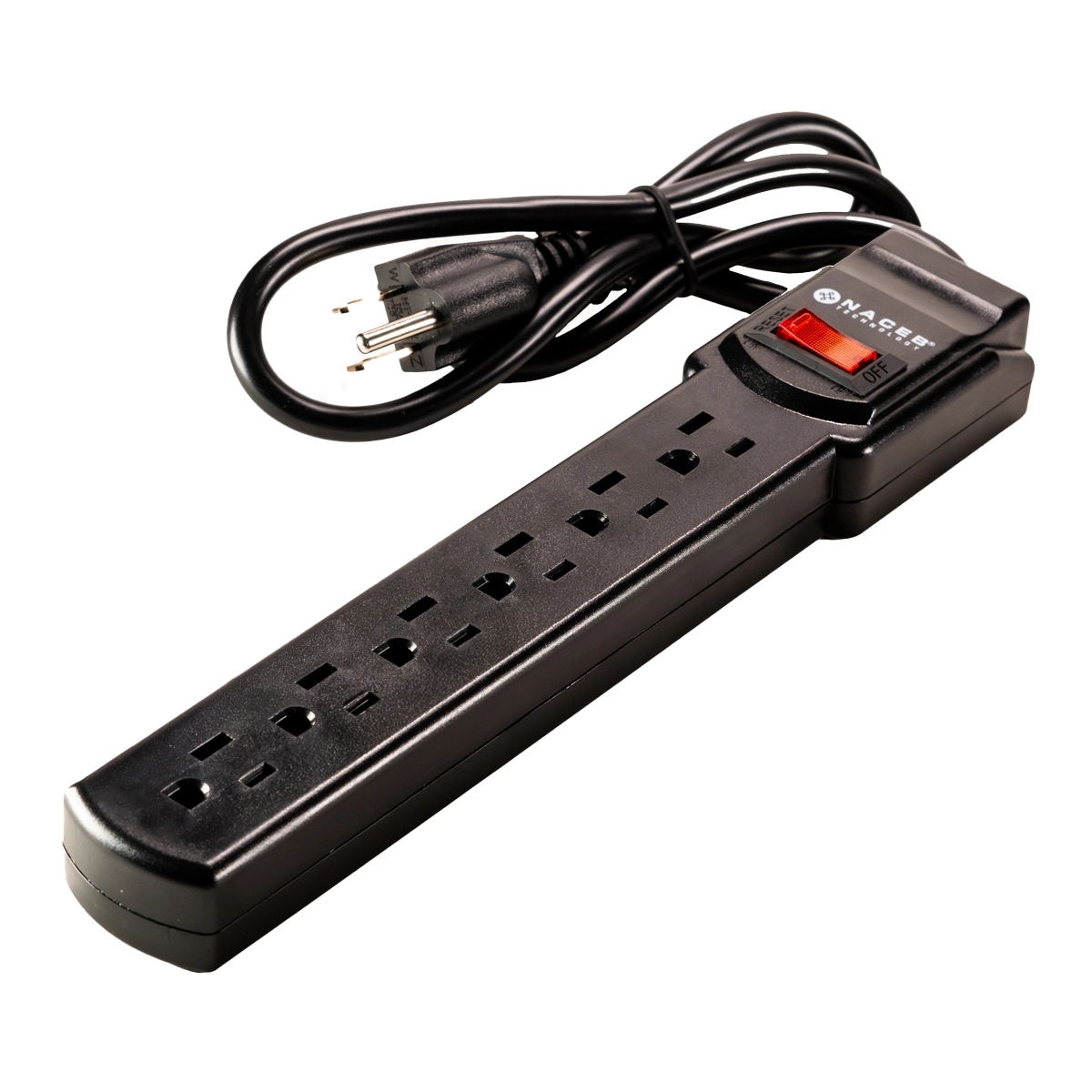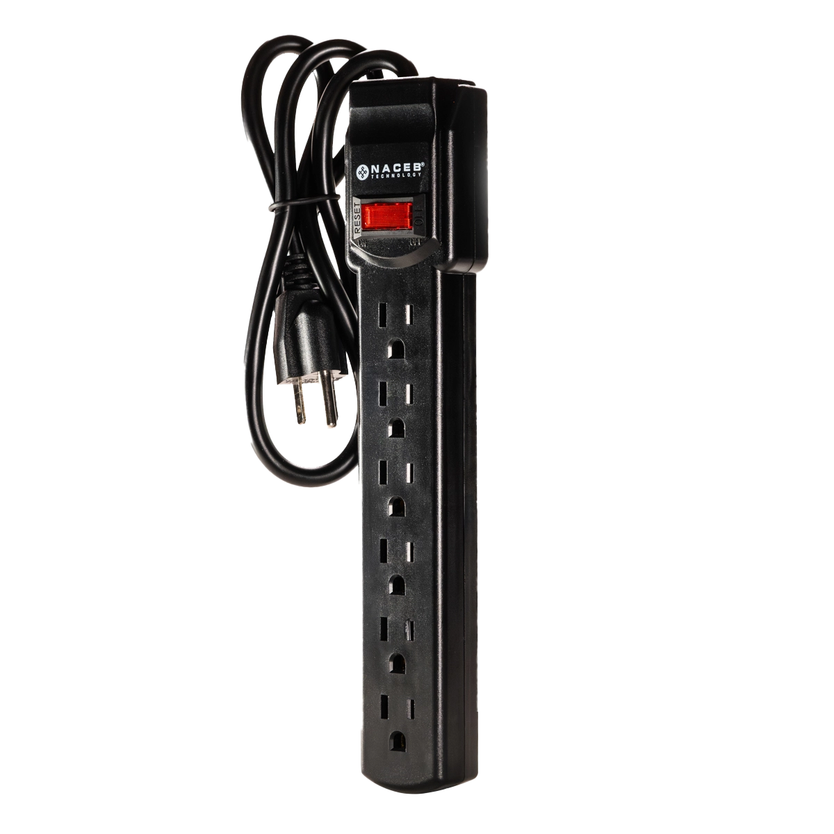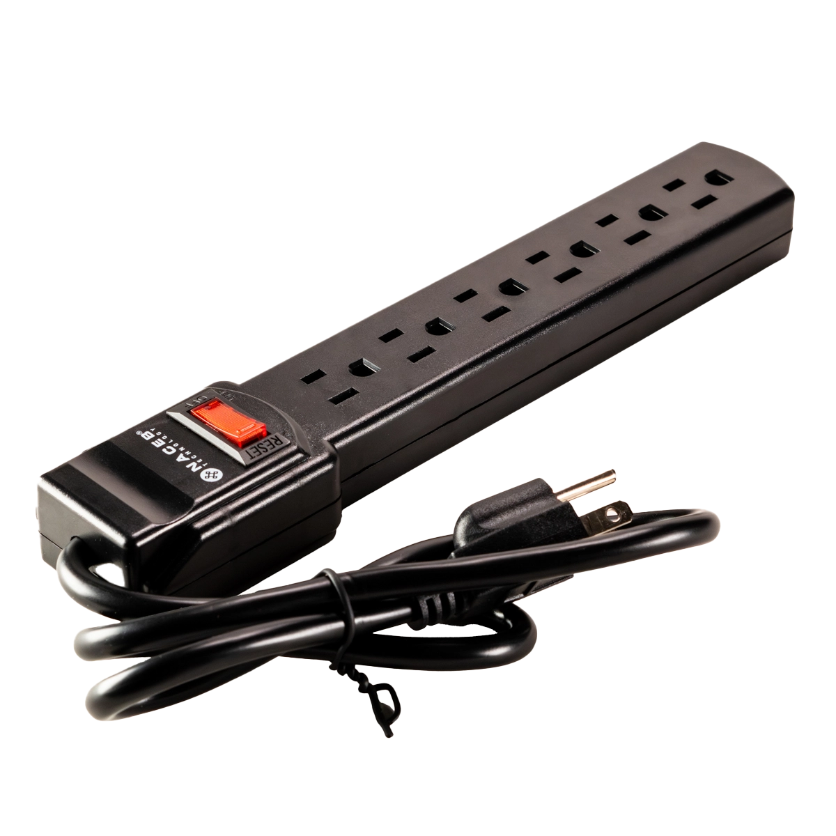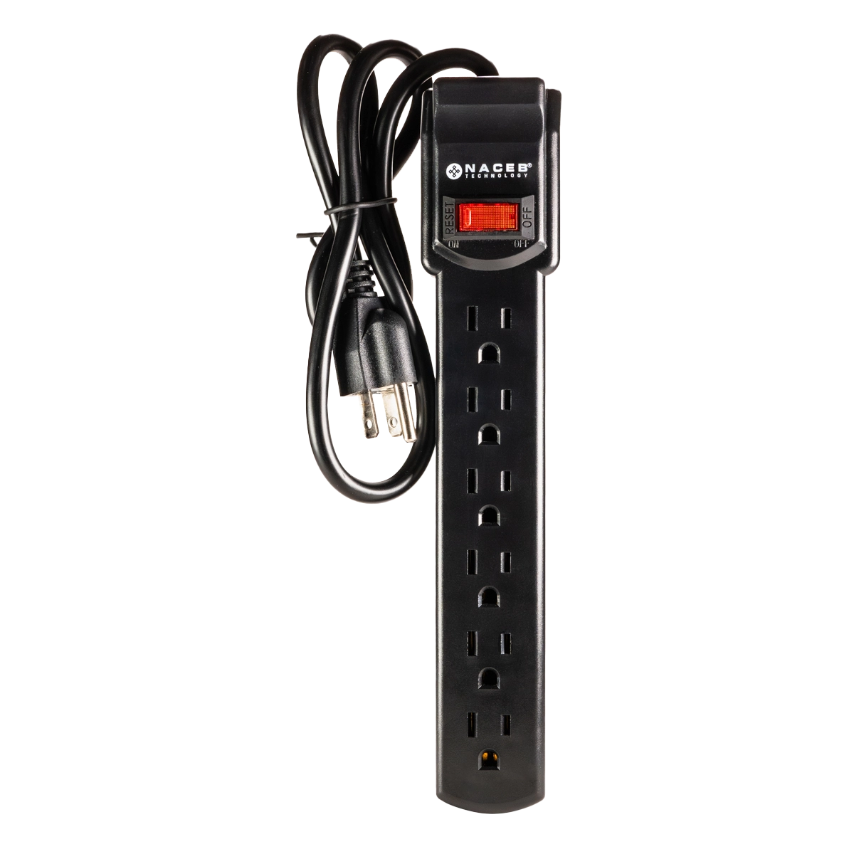 Barra multicontacto de 6 entradas con protección contra sobre tensión de 90 J, cable de 79 cm y carcasa de ABS resistente al fuego.