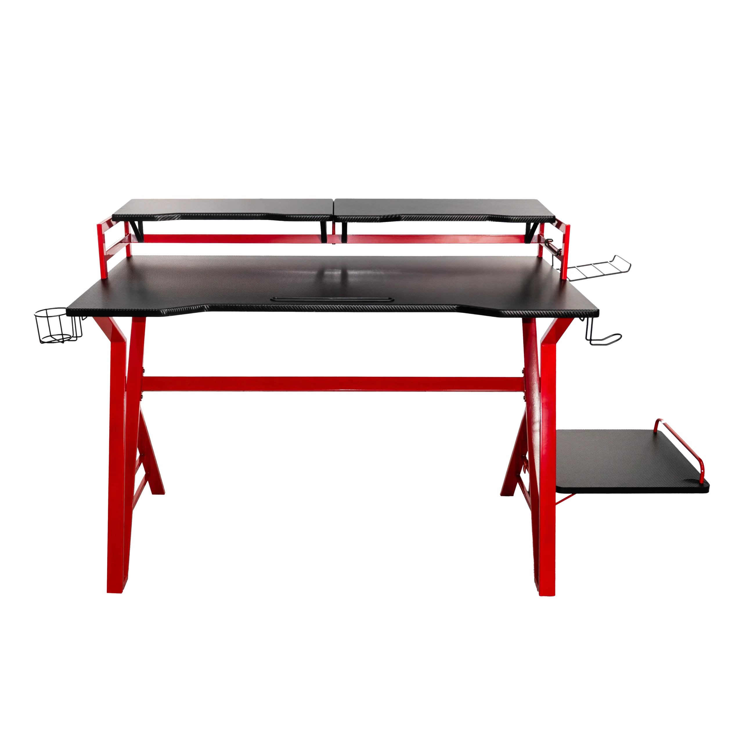 Cuenta con un elegante diseño de fibra de carbono y una robusta construcción de acero que lo convierte en un mueble duradero y estable, gran espacio con mousepad incluido y dos plataformas laterales.