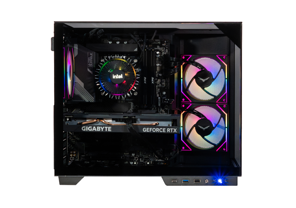 Gabinete ATX compacto con paneles de cristal templado, 3 ventiladores ARGB incluidos. Incluye USB 3.0, Tipo C y espacio para hasta 3 unidades de almacenamiento.