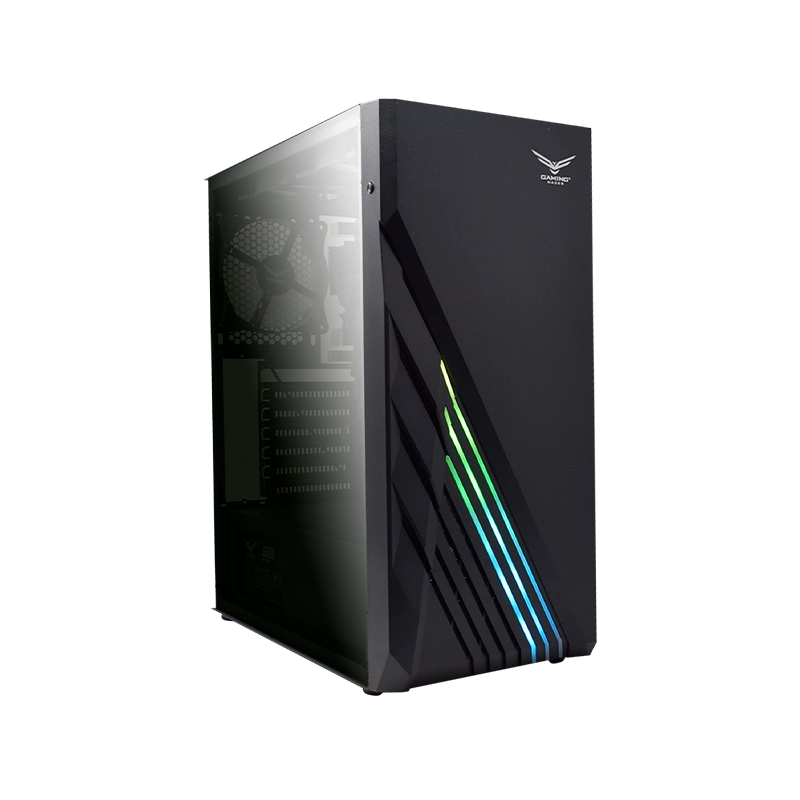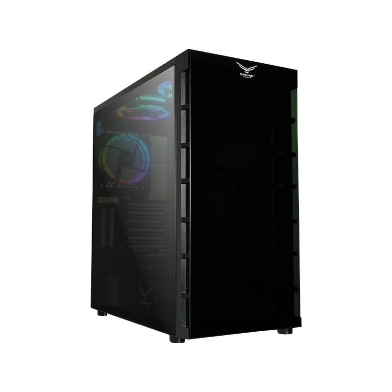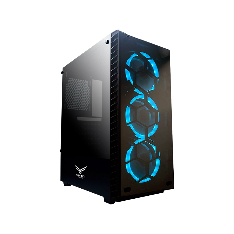 Gabinete ATX compacto con paneles de cristal templado, 3 ventiladores ARGB incluidos. Incluye USB 3.0, Tipo C y espacio para hasta 3 unidades de almacenamiento.