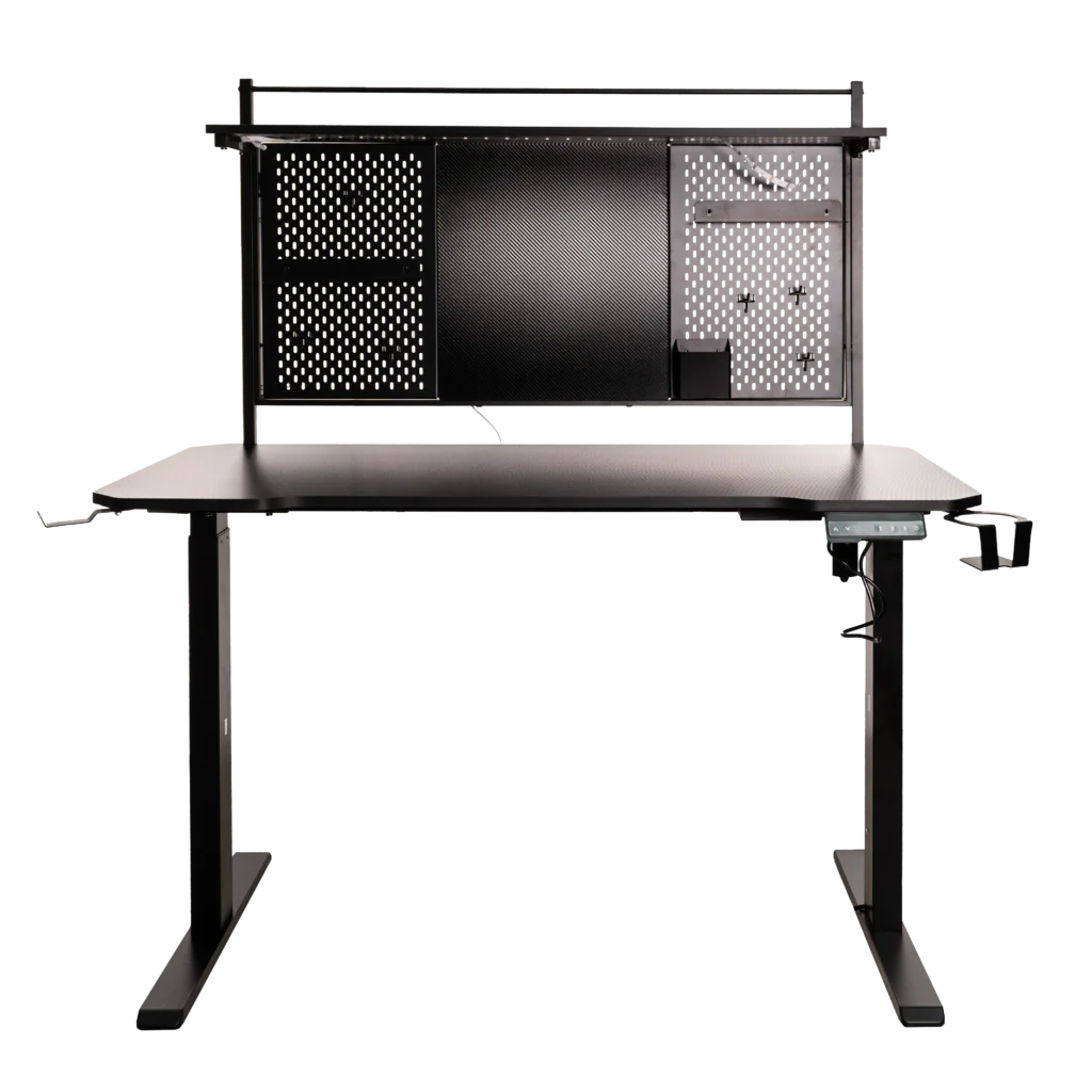Cuenta con un elegante diseño de fibra de carbono y una robusta construcción de acero que lo convierte en un mueble duradero y estable, con tres niveles de altura que puedes ajustar a tu gusto y con iluminación LED ajustable con control remoto incluido.