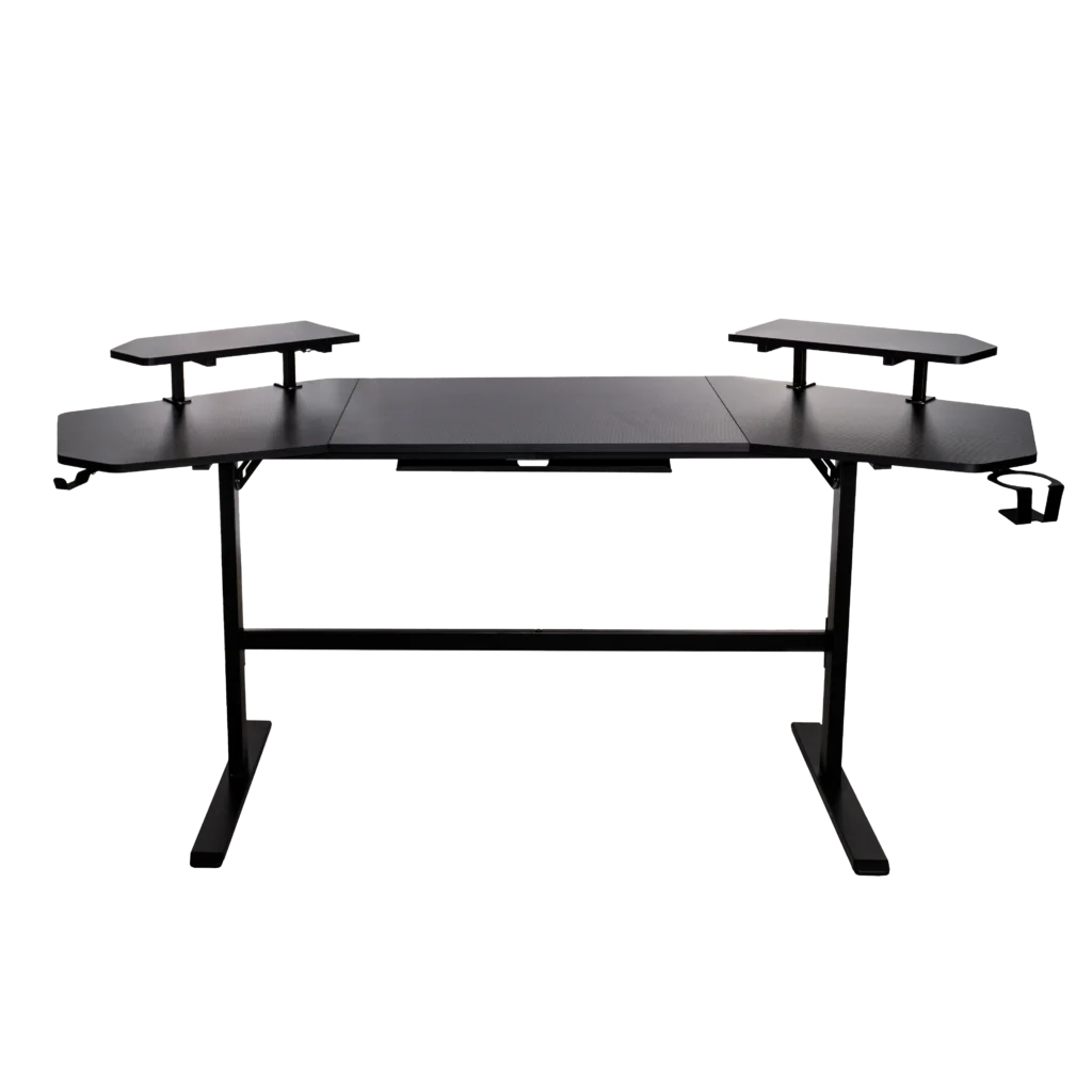 Cuenta con un elegante diseño de fibra de carbono y una robusta construcción de acero que lo convierte en un mueble duradero y estable, gran espacio con mousepad incluido y dos plataformas laterales.
