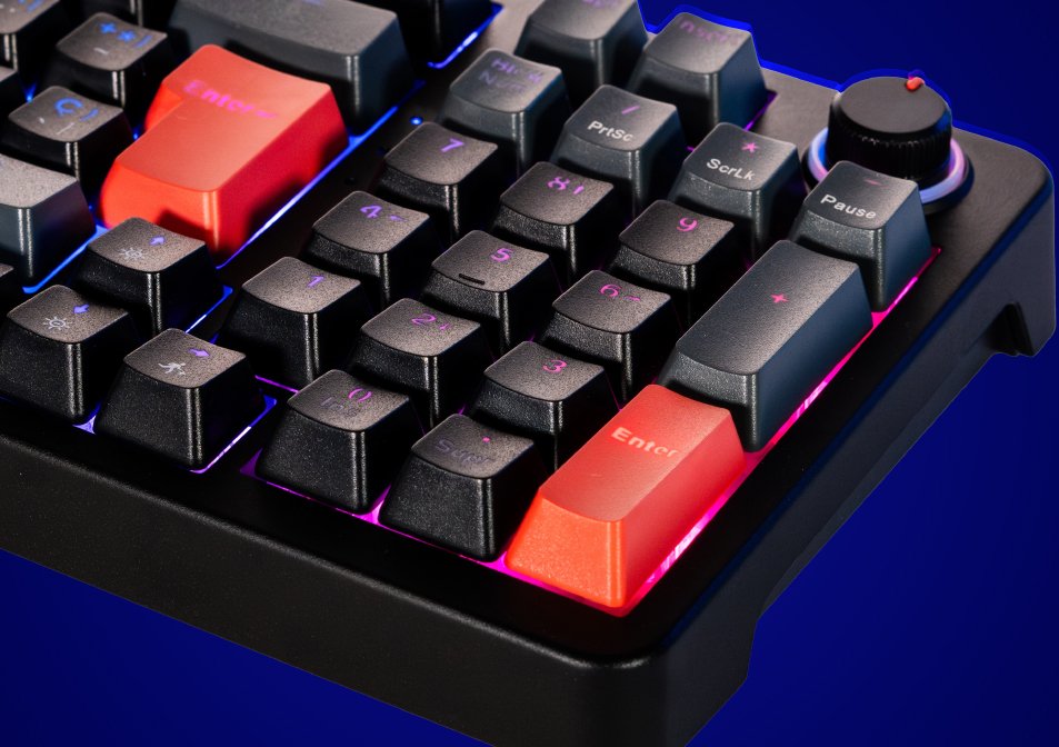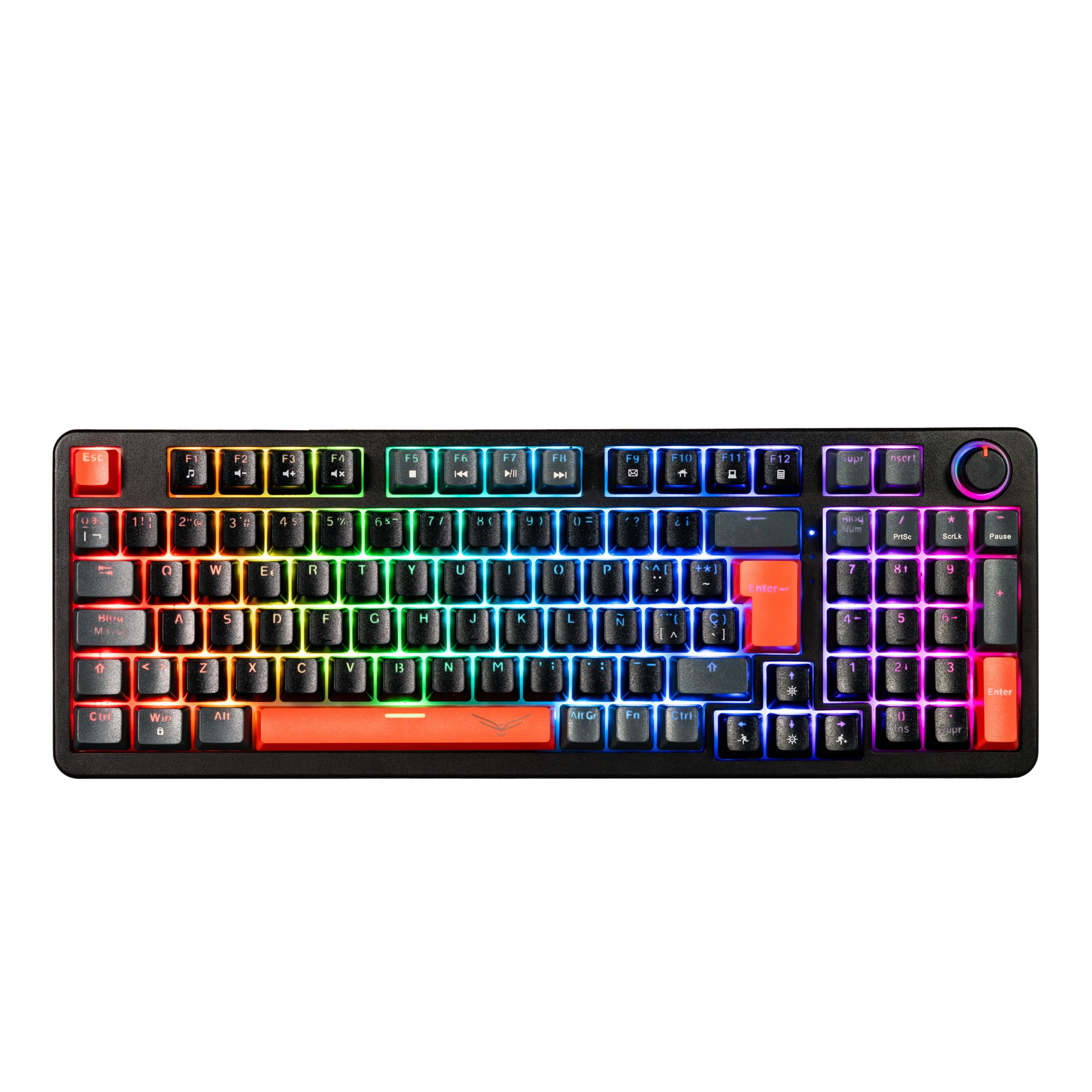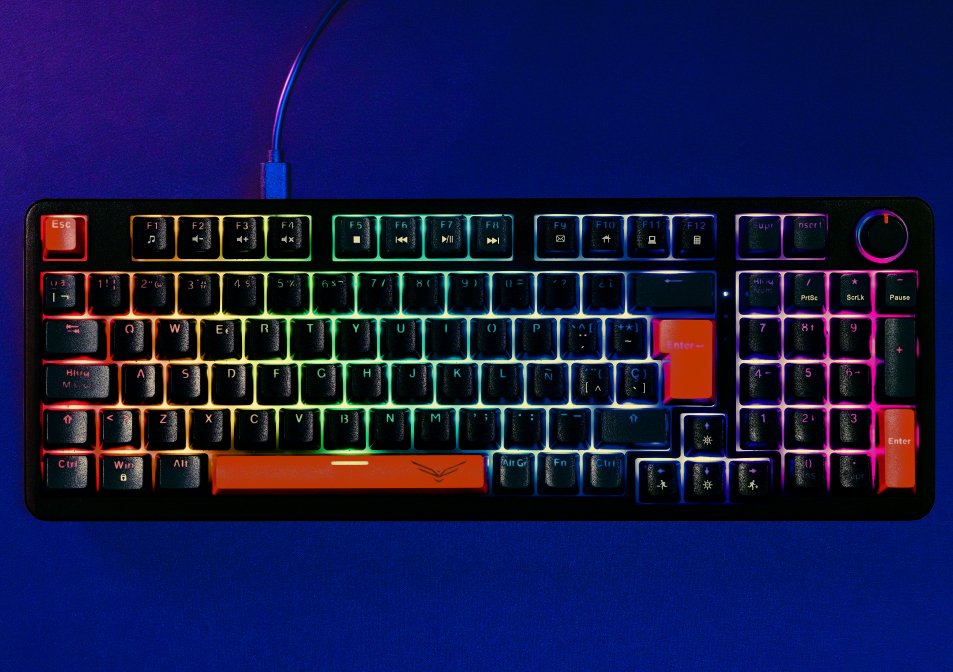 Teclado 95% que combina potencia y comodidad: switches HUANO rojos, perilla multimedia y RGB para trabajar y jugar con estilo