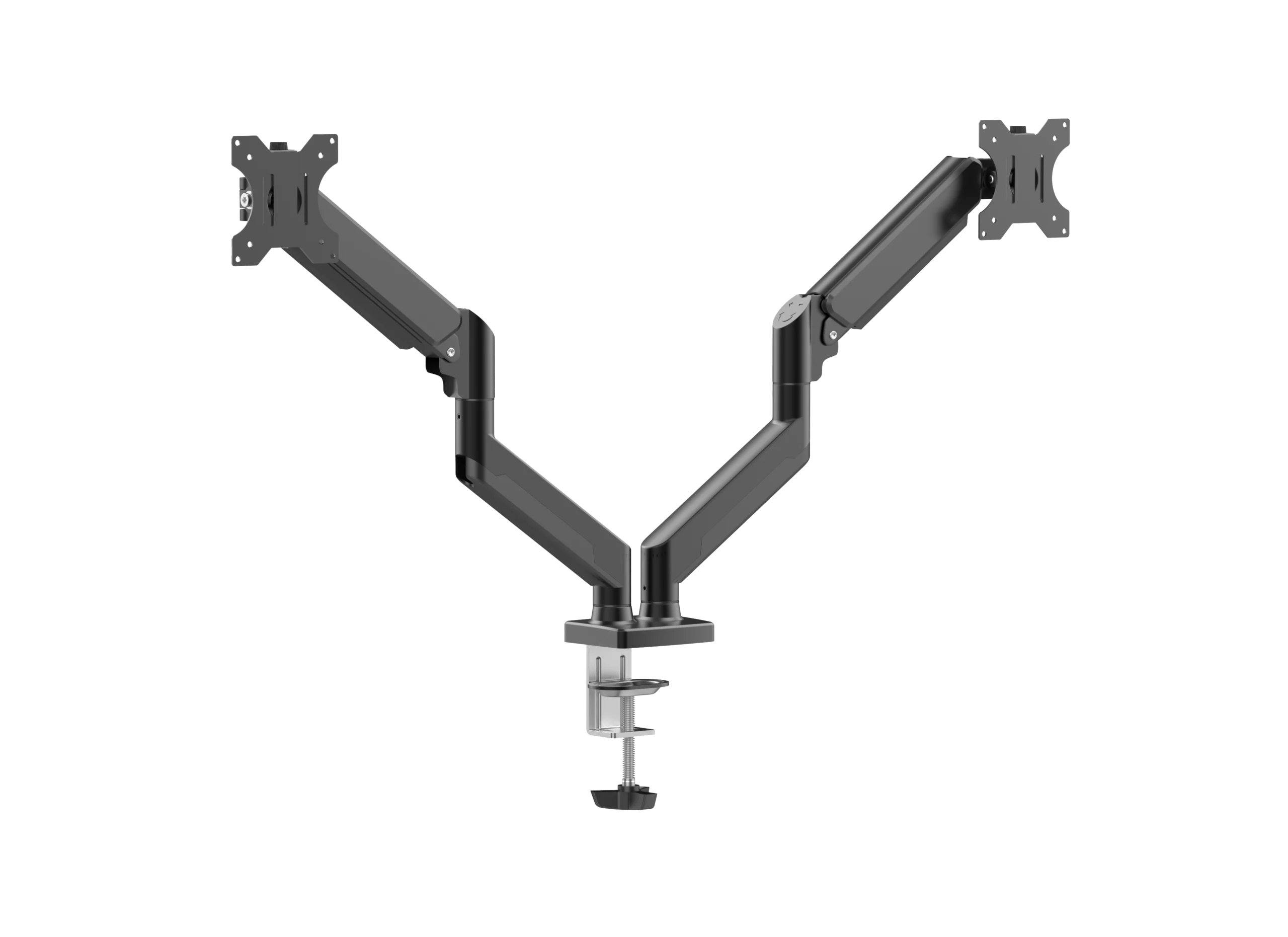 Soporte articulado negro de aluminio y acero, brazo de 45 cm, pasacables y compatible con monitores de 10” a 32”.